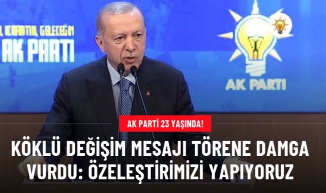 Cumhurbaşkanı Erdoğan, AK Parti 23. Kuruluş Yıldönümü Programı'nda açıklamalarda bulunuyor. AK Parti ailesi olarak gururlu olduklarını ifade eden Erdoğan, "Millete hizmet yolunda 23. yılımız için herkese teşekkür ederim" dedi. AK Parti Olağan Büyük Kongresi'ne vurgu yaparak partideki değişim sürecine atıfta bulunan Erdoğan, "Özeleştirimizi samimiyetle yapıyor, eksiklerimizin üzerine gidiyoruz. Kongre maratonumuzu milletimizin bizden beklediği kapsamlı değişimin ana zemini olarak görüyoruz. Hangi görevde olursa olsun hiçbir arkadaşım koltuğuna kapılıp rehavete kapılamaz. Biz bu aziz milletin umuduyuz. Biz aziz ümmetin de umuduyuz. Onların umudunu boşaa çıkaracak işlere girenler altından kalkamayacakları vicdani yükle ezilir. Umutları ziyan edenlere hoş görü göstermeyiz, gözünün yaşına bakmayız. Tazelenerek ilerlerken kimsenin bize ayak bağı olmasına müsaade etmeyiz" dedi.