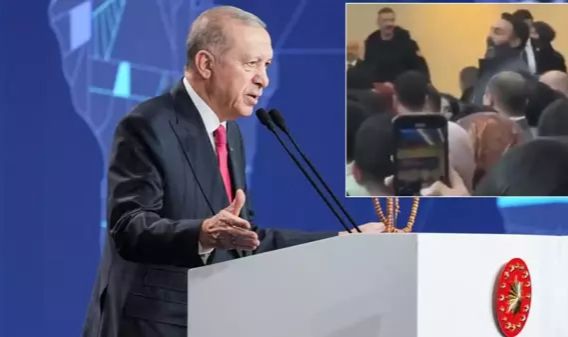 Bu esnada sözlerine ara veren Cumhurbaşkanı Erdoğan, "Yavrum, burada siyonistlerin ağzı, dili olma... Siyonistlerin ağzı dili olmak suretiyle burayı provoke etmeye ne kadar çalışırsanız çalışın netice alamazsınız. Dünyadaki siyonistler Tayyip Erdoğan'ın nerede durduğunu çok iyi biliyor ama siz hala anlamamışsınız" sözleriyle kendisine seslenen kişiye karşılık verdi. Protestocu şahıs, daha sonra görevliler tarafından salondan çıkarıldı.