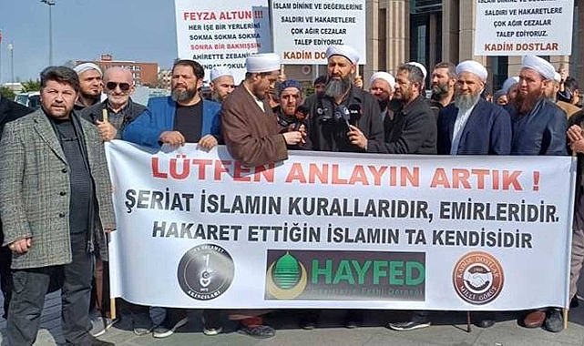 Şeriatçılar Adliye Önünde: 'Allah İçin Koruma Kanunu' İstedilerGrup, adliye önünde toplanarak yaptıkları açıklamada, "Allah için koruma kanunu" talebinde bulundu.HAYFED yöneticisi Nusret Oktar, yaptığı açıklamada zaman zaman Arapça konuştu ve dünya genelinde Müslümanların zulme uğradığını iddia ederek inançlarına küfredildiğini belirtti. Feyza Altun hakkında suç duyurusunda bulunduklarını ifade eden Oktar, meseleyi "Türkiye laiktir, laik kalacak" konusu olarak görmeyip, "Ne istiyoruz? Nasıl Atatürk'ü koruma kanunu varsa, nasıl Cumhurbaşkanına küfreden hapse atılıyorsa, biz Allah için de koruma kanunu, resulullah için de, dinlerimiz, değerlerimiz için de koruma kanunu çıkartılsın istiyoruz. Bunu hükümetten istiyoruz." şeklinde dile getirdi.Şeriat karşıtı sözleriyle bilinen Feyza Altun'un suç duyurusuyla ilgili gelişmeler kamuoyu tarafından yakından takip edilmektedir.