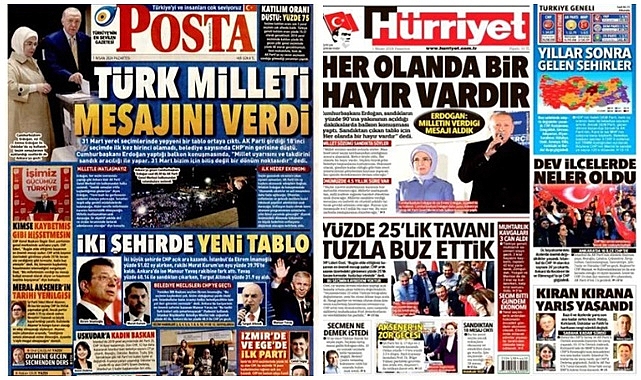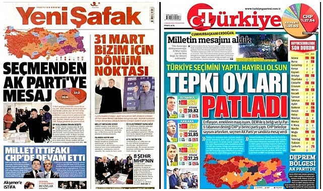 Yeni Şafak: Yandaş Yeni Şafak gazetesi, "Seçmenden AK Parti'ye Mesaj" başlığı altında seçim sonuçlarına ilişkin eleştirilerde bulundu. Gazete, AKP'nin 2002'den bu yana katıldığı tüm seçimlerden zaferle çıktığı ilk kez başarılı olamamasını, hayat pahalılığı, emeklilerin maaşlarını yetersiz bulması ve bazı adaylarla ilgili tartışmaların etkisiyle ilişkilendirdi.Posta: Posta gazetesi, "Türk Milleti Mesajını Verdi" başlığı altında seçim sonuçlarını değerlendirdi. Gazete, AKP'nin 18. seçiminde birinci olamamasını ve CHP'nin belediye sayısının artmasını vurgulayarak, Türk milletinin verdiği mesajı yansıttı.Hürriyet: Hürriyet gazetesi, "Sandığın Mesajı" başlığı altında AKP'ye yakın olan Cumhurbaşkanı Recep Tayyip Erdoğan'ın "Her olanda bir hayır vardır" sözünü manşete taşıdı. Gazete, CHP'nin 14 büyükşehir belediyesi olmak üzere toplamda 35 ilde başkanlığı kazanmasını ve seçim sonuçlarının halkın iktidara mesajı olarak algılandığını belirtti.Sabah: Yandaş Sabah gazetesi, "Demokrasi Kazandı" başlığıyla çıkarak, Cumhurbaşkanı Erdoğan'ın sözlerine yer verdi ve seçim sonuçlarını demokrasi zaferi olarak değerlendirdi.Akit: Yandaş Akit gazetesi, "Belediyeler Kirli İttifaka Teslim" başlığıyla çıkarak, seçim sonuçlarını hazmedemediğini belirtti ve eleştirel bir tutum sergiledi.